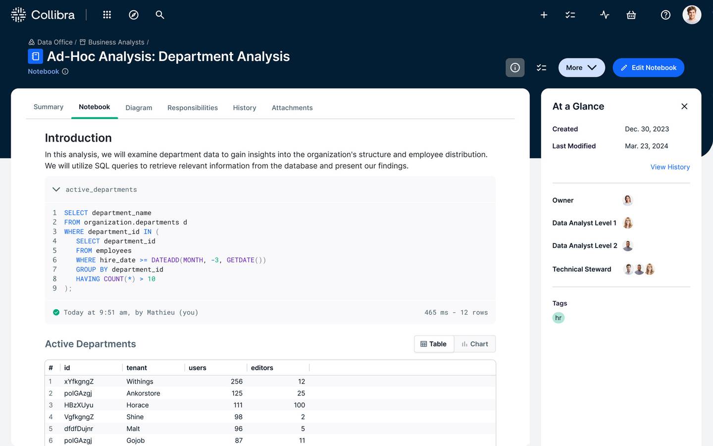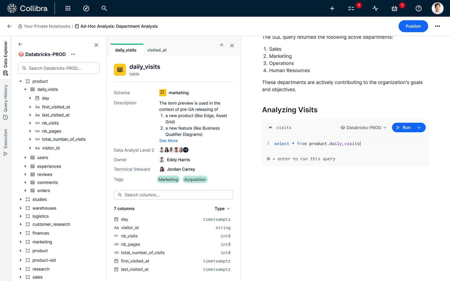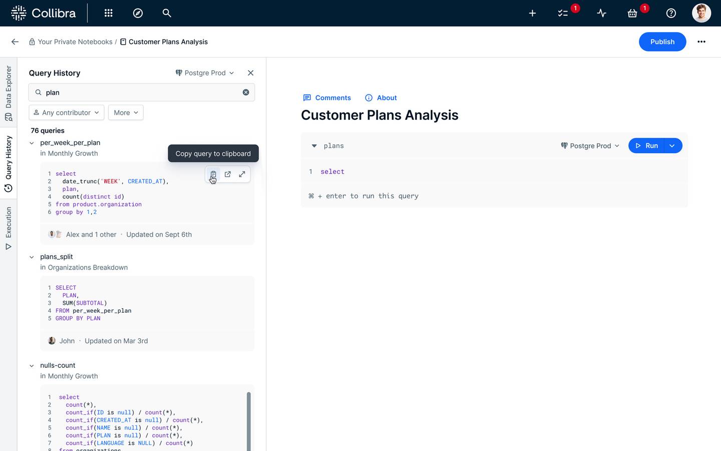 Query and document data within a governed environment to foster collaboration, ensure shared confidence in insights and enhance trusted data consumption. Publish and share SQL queries, visualizations, approaches and best practices within notebooks to boost knowledge exchange and productivity.